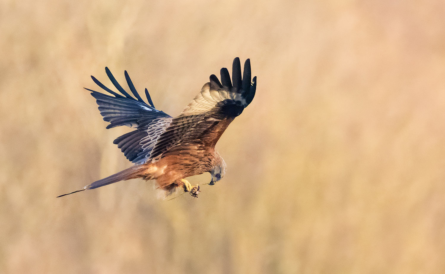 With the sun getting lower, one bird decided to catch a small mammal, probably a Field Vole, and then flew off with it's prize, proving that Red Kites are not purely scavengers.