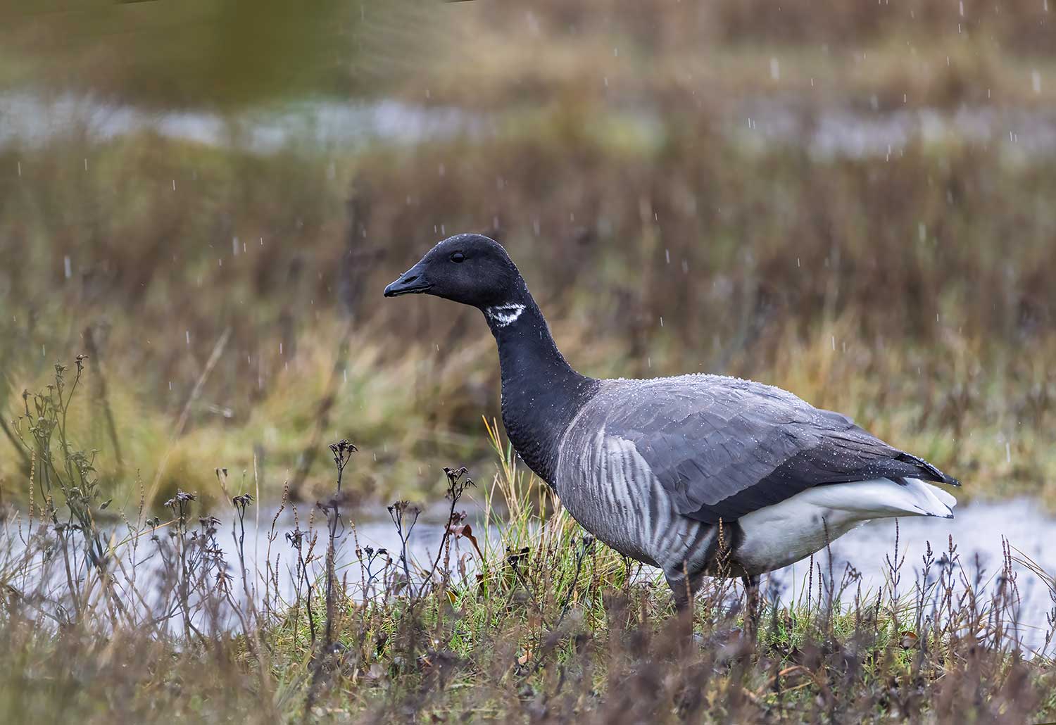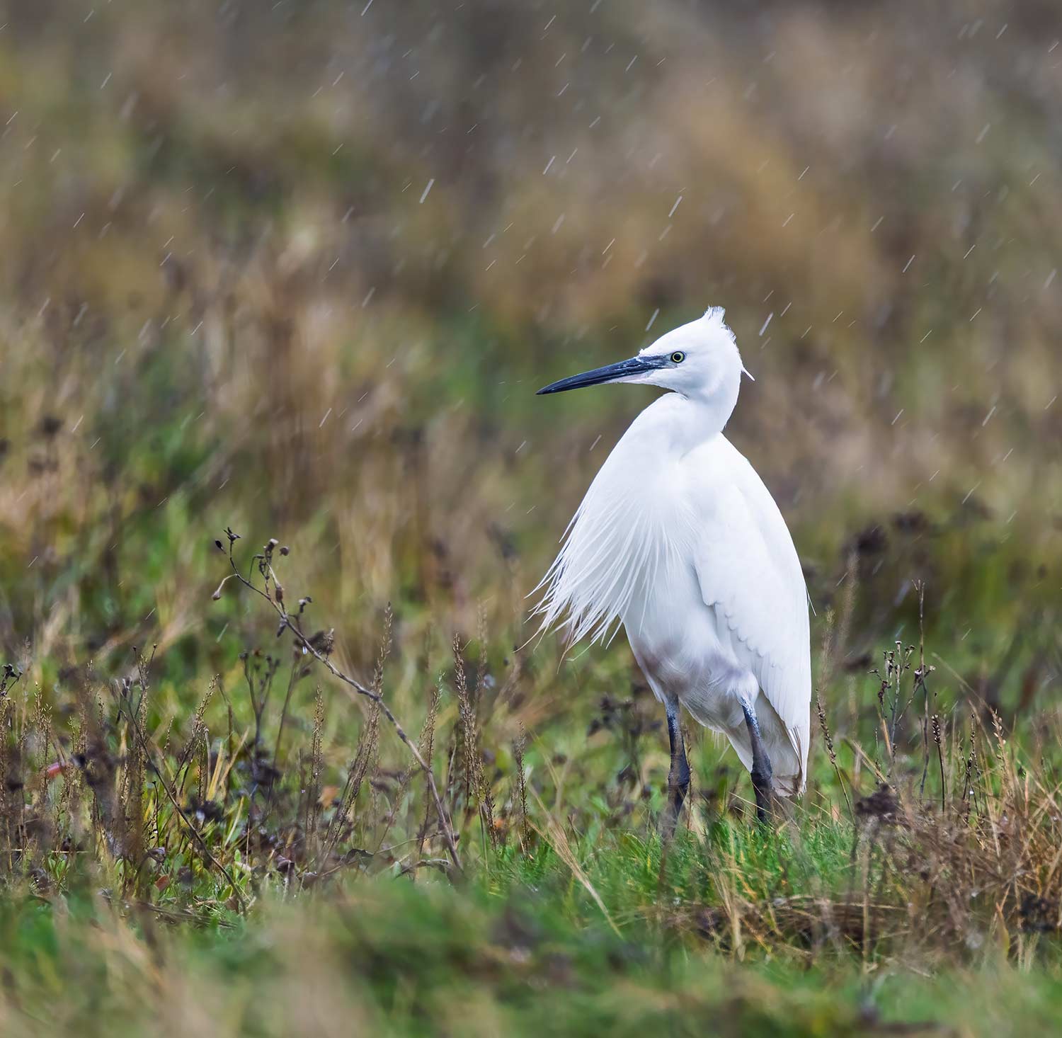 and a Little Egret feeding in the, by now, heavy rain.