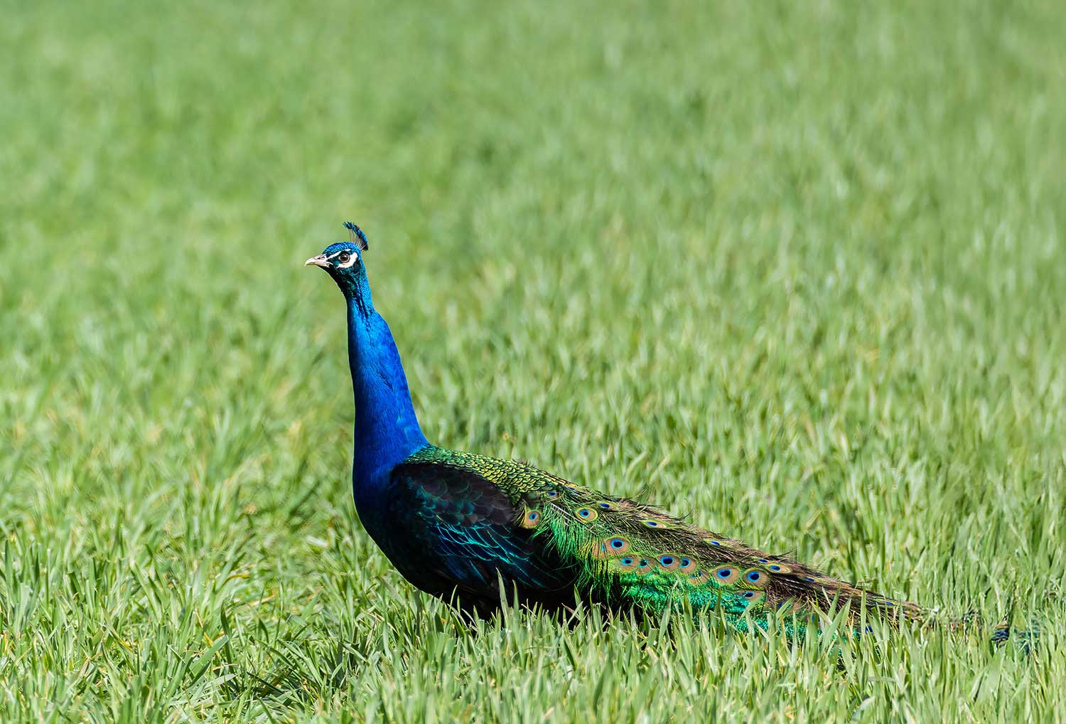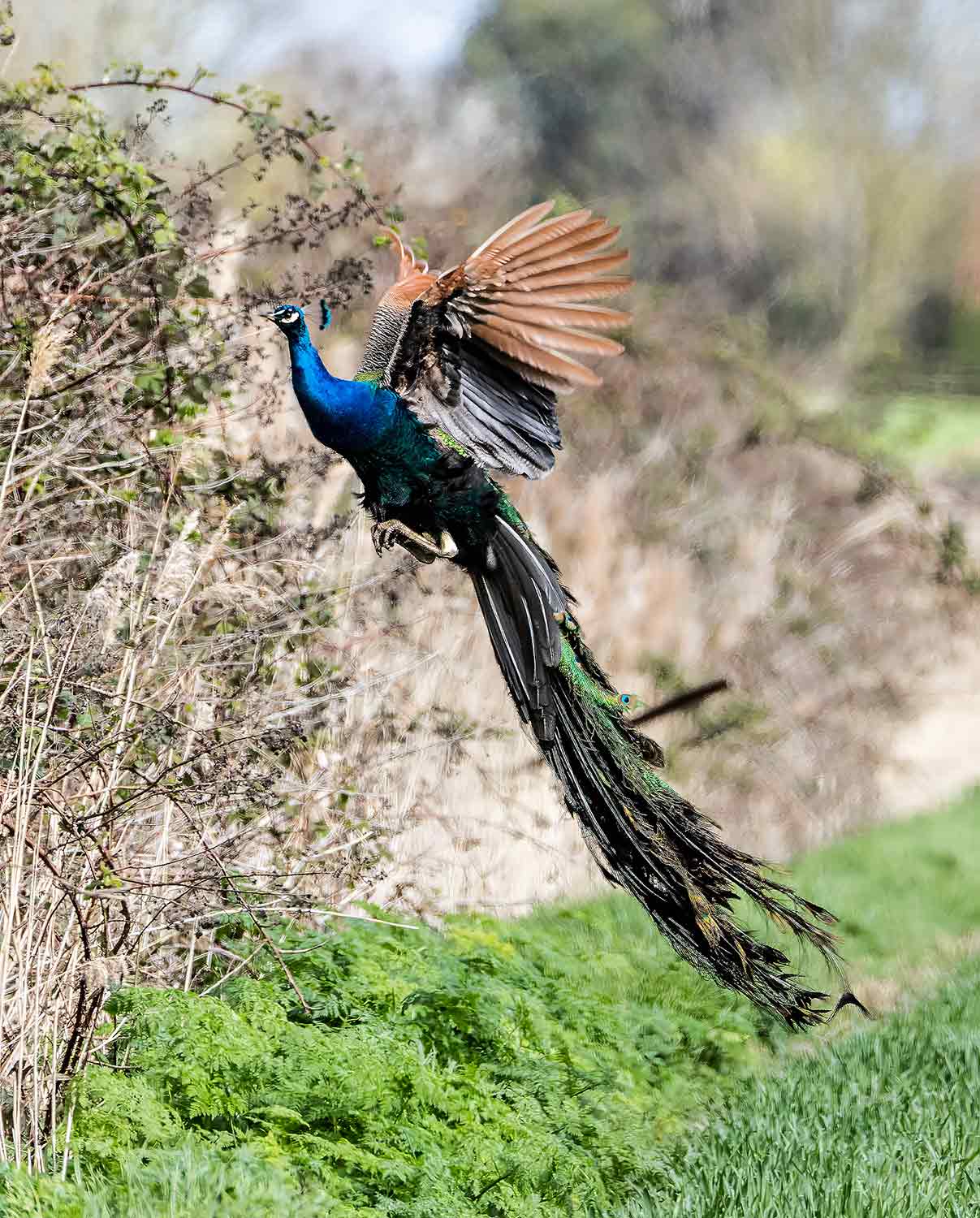 So, moving on, I called in to Burwell Fen from the Swaffham Prior end. Result - zilch - but, surprisingly, on the way back, there was a small flock of Peacocks in a roadside field, obviously domesticated although they did not appear so as they proved to be very wary of my camera from the car. Interest in my attention rapidly turned into nervousness until they either disappeared into a hedge or flew over it.