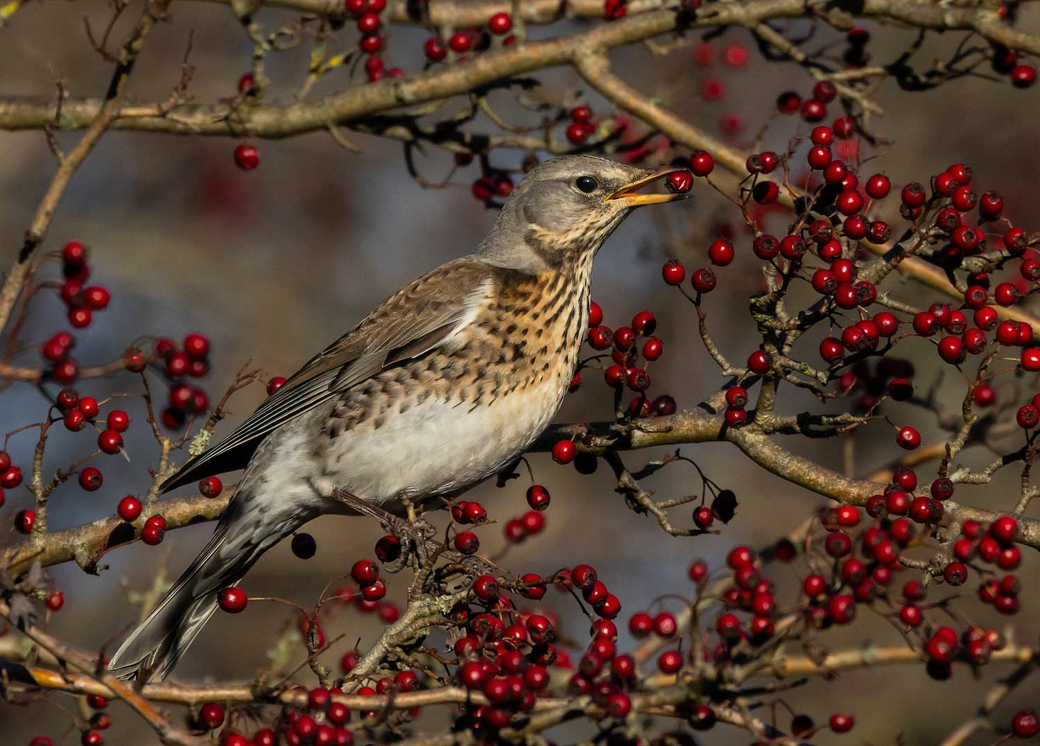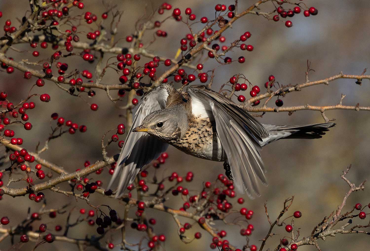 First off, there were several largish flocks of Fieldfares around. They are always very wary and flighty, in my experience but, eventually, I managed a few shots worth keeping.