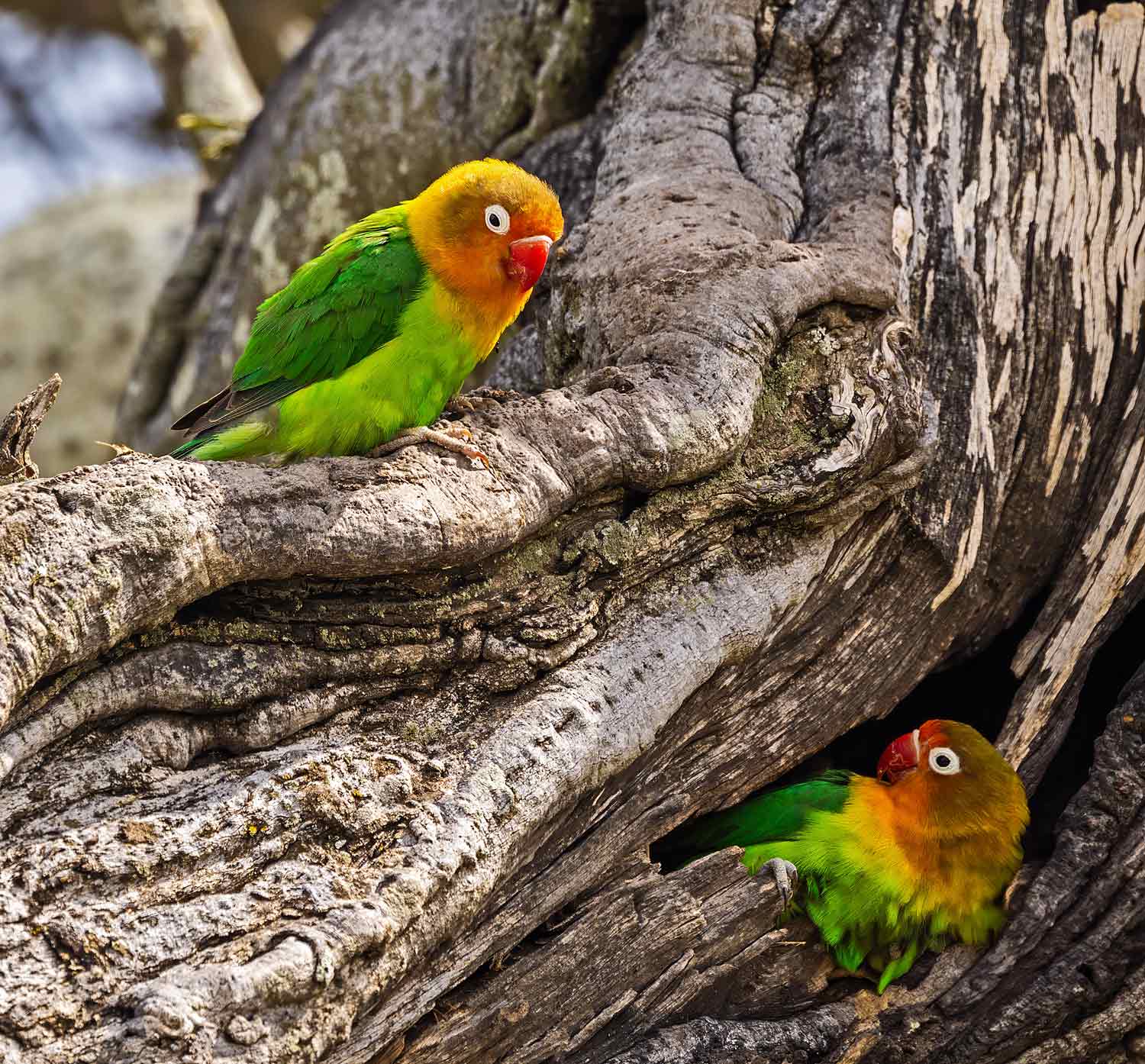 We found a pair of Fischer's Lovebirds making a nest in an old tree
