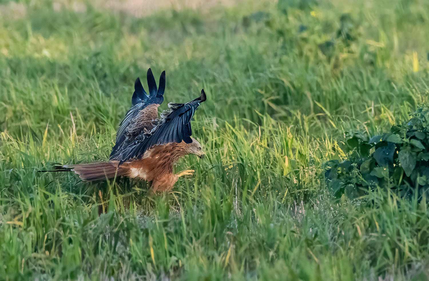 With the sun getting lower, one bird decided to catch a small mammal, probably a Field Vole, and then flew off with it's prize, proving that Red Kites are not purely scavengers.
